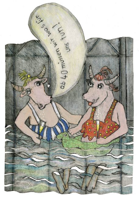 Seit der BSE-Affäre beschäftige ich mich mit Gesprächen aus dem Kuhstall. Die Kühe oder ihre männlichen Partner geben Kommentare zu jeweiligen aktuellen gesellschaftlichen Situationen oder Ereignissen ab. Festgehalten werden diese Unterhaltungen artgerecht auf der Innenseite von Milchtüten, die eine Grundlage für Tiefdrucke bilden.